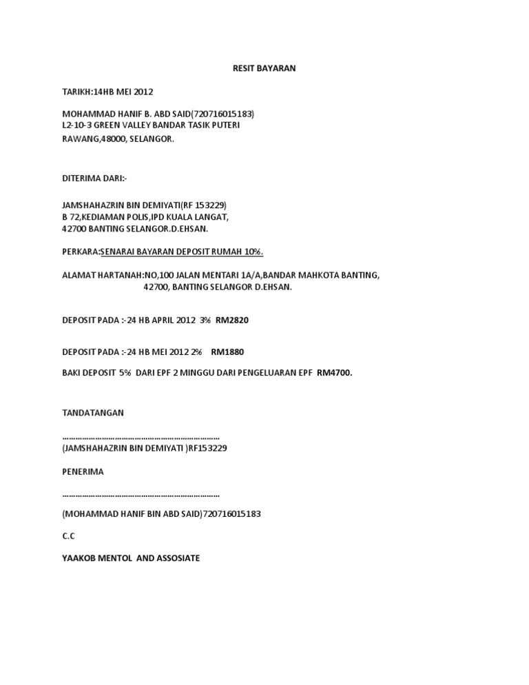Contoh Surat Pembayaran Deposit Rumah - Contoh surat perjanjian jual beli rumah | secara umum surat adalah sebuah sarana komunikasi dalam bentuk tulisan tangan atau dalam bentuk ketikan.. Demikian surat perjanjian kontrak rumah desa citran rt 02 rw xi pucangan, kartasura, sukoharjo ini disetujui pada hari sabtu, 27 oktober 2012 dan surat perjanjian ini rangkap 2 (dua) serta mempunyai kekuatan hukum yang sah. By posted on may 8, 2021. Kumpulan gambar contoh surat tuntutan bayaran deposit terbaik 2019. The collection that consisting of chosen picture and the best amongst others. Bayaran wang deposit kadar satu bulan sewa yang bejumlah rm_____ (ringgit malaysia :