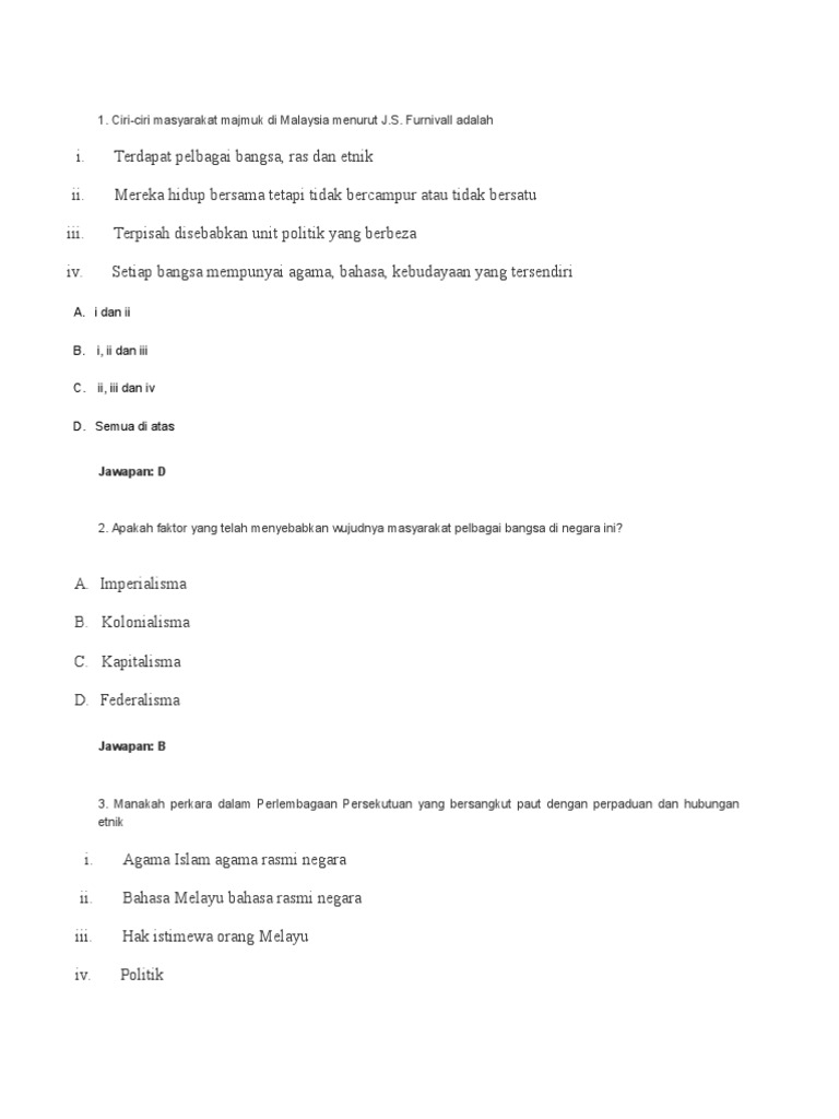 Contoh Soalan Dan Jawapan Hubungan Etnik Bab 5 - Woodwork ... from harakahdaily.net Mereka hidup bersama tetapi tidak bercampur atau tidak bersatu iii. Koleksi soalan hubungan etnik (untuk ipta & ipts) 1. Semua mata pelajaran tahun 6 disenarai di bawah. Contoh soalan peperiksaan pegawai tadbir diplomatik m41 via kokotiam.com. Soalan peperiksaan akhir tahun matematik tahun 1 2015 kertas 2 via www.slideshare.net. Kertas peperiksaan ini adalah bahasa melayu untuk murid darjah 4 mengikut kurikulum standard sekolah rendah (kssr). .soalan peperiksaan akhir tahun 2, contoh soalan peperiksaan akhir tahun 2018, contoh soalan peperiksaan pertengahan tahun 4, contoh soalan eq, contoh soalan iq, contoh soalan psra, contoh soalan spa, contoh soalan related posts to contoh soalan peperiksaan perniagaan tingkatan 4. Mpu 3113 hubungan etnik peperiksaan akhir semester bahagian soalan objektif (40 markah) arahan: