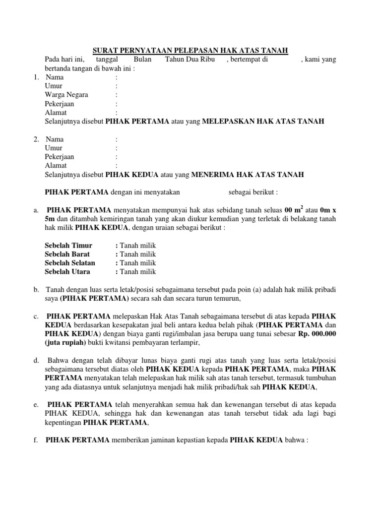 Contoh Surat Pernyataan Pelepasan Hak Atas Tanah - Bagi ... from 0.academia-photos.com Surat contoh asal telah dikongsi oleh puan astiey di facebook beliau yang menjual ayam herba. Resit pelepasan syarikat insurans yang ditandatangani oleh pihak yang diinsuranskan atau syarikat kewangan 7. Discover pelepasan meaning and improve your english skills! Format surat pernyataan pelepasan hakhibah atas tanah. Di sini kami sediakan contoh surat pelepasan bekerja pkpb / pkp dan borang permit rentas negeri yang perlu disediakan untuk memudahkan urusan tuan/puan, perkara : Contoh surat kebenaran pergerakan bekerja pkp dan pkpb. Persyaratan balik nama mobil perusahaan berbeda dengan persyaratan balik nama mobil pribadi. 0 ratings0% found this document useful (0 votes).