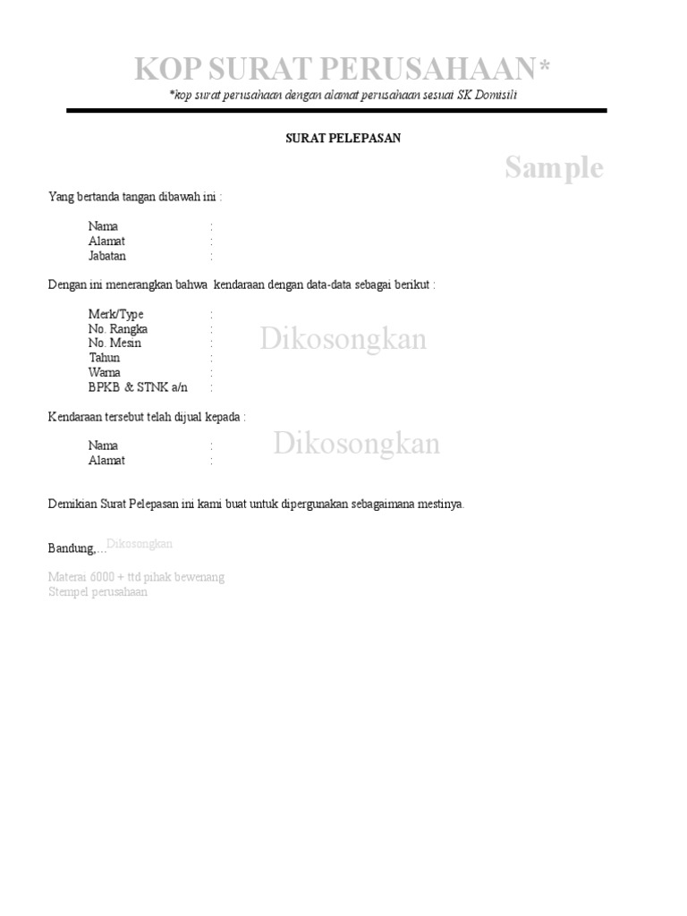 Berdasarkan pasal 1 angka 6. Surat kebenaran pelepasan perjalanan kepada pekerja bertugas dalam tempoh pkpb/pkp. Surat pelepasan daripada syarikat kewangan (jika relevan) 6. 1 popular form of abbreviation for surat pelepasan hak updated in 2021. Persyaratan balik nama mobil perusahaan berbeda dengan persyaratan balik nama mobil pribadi.